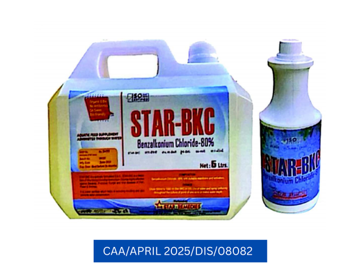 STAR BKC-80% INGREDIENTS : Benzalkonium Chloride – 80%Suitable stabilizers and activatorsWt/GMS BenefitsSTAR-BKC is a specially formulated Benzalkonium Chloride (B.K.C.).STAR-BKC is a stable form of Alkyl Benzyl Dimethyl Ammonium Chloride.Highly effective against bacterial, protozoal, fungal, and viral diseases of fish, prawn, and shrimps.DosageDilute 500 ml to 1000 ml STAR-BKC in 100 liters of water and spray uniformly throughout the pond.